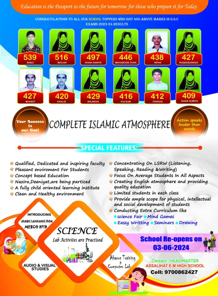 In 2002, the ‘Assalihat English Medium High School’ was established in Ravindra Nagar, Kadapa, to provide modern academic education along with religious instruction to students. This is a governmentrecognized institution, where education is provided from nursery to 10th grade. The students are educated in an Islamic environment, and only day scholar facilities are available. Around 320 students are currently enrolled and pursuing their education here.